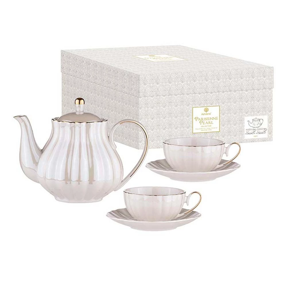 Catch up with a friend over freshly brewed tea served from the gorgeous Ashdene Parisienne Pearl Teapot & 2 Teacup Set White