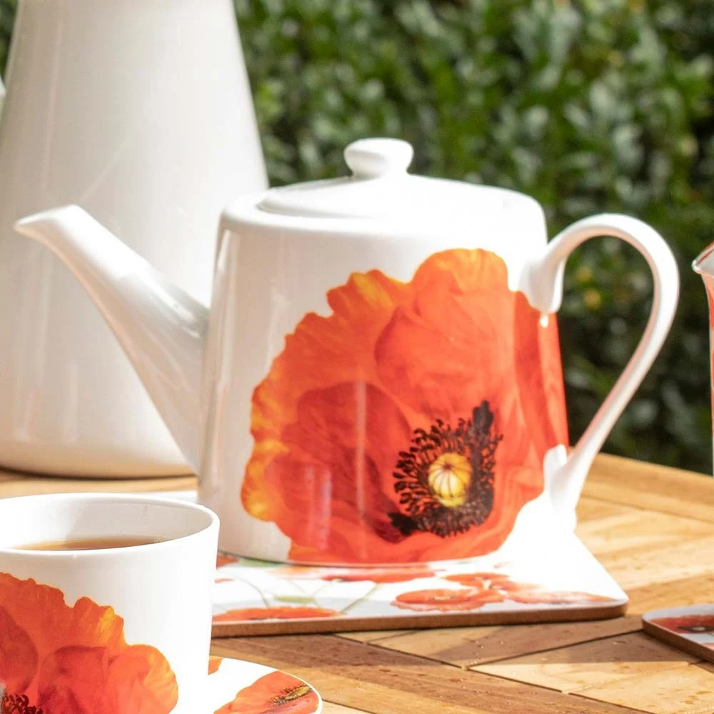 The Ashdene Red Poppies 900ml Infuser Teapot features stunning poppy illustrations by leading botanical artist Jenny Phillip