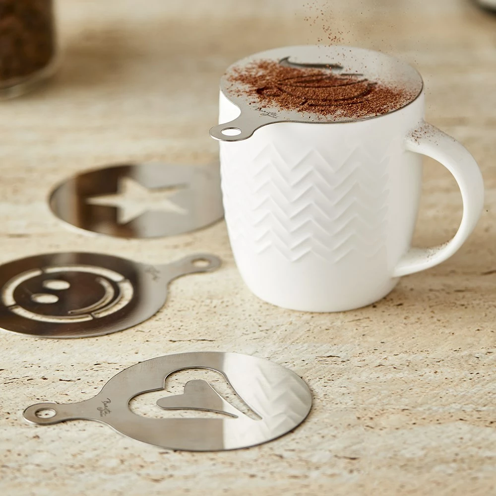 - Easy to use, simply hover the stencil over your coffee and dust cocoa powder