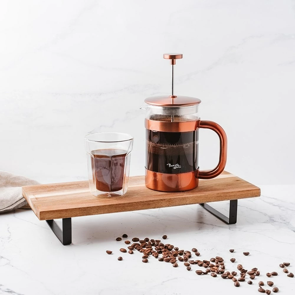 Enjoy the ultimate coffee indulgence at home with the stylish copper coloured Baccarat Barista Brillante Stainless Steel & Glass French Coffee Press 800ml! Ideal for kick starting your morning with delicious aromatic coffee, this accessory is a must-have for achieving authentic French style pressed from the comfort of your home. Versatile in function, this coffee press can also be used for creating flavoursome tea infusions. It is exceptionally simple to use and comes equipped with an easy glide plunger with a micro mesh filter that allows the coffee grounds to be pressed down while enabling the full flavour to be extracted from the coffee. Made from ultra-tough borosilicate glass and stainless steel, this stylish copper coloured French coffee press offers enduring appeal and lasting durability. It comes presented beautifully boxed and makes a wonderful gift for housewarmings, birthdays and other special occasions!