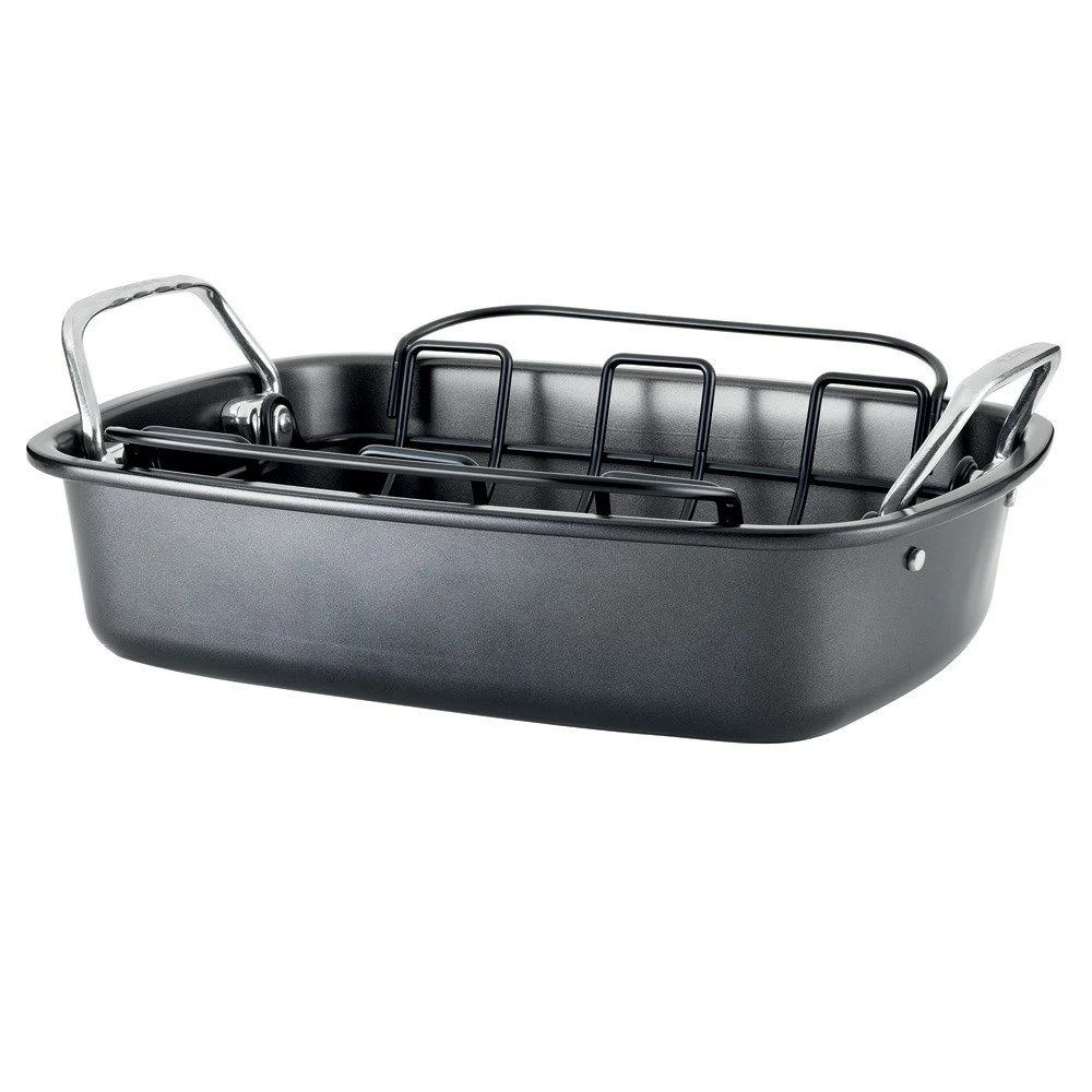 - Designed with riveted cast aluminium handles. Roaster measures 45 x 38 x 16cm including handles and roasting rack