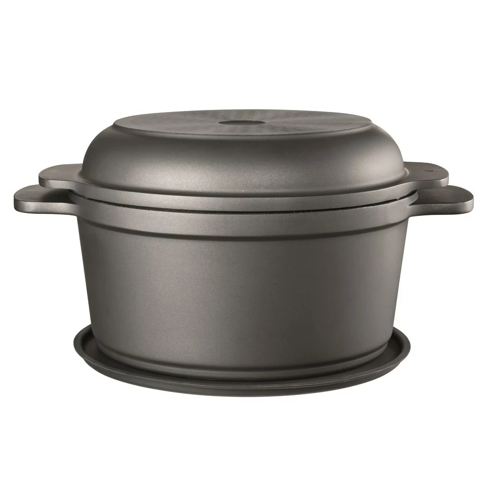 - Includes die cast aluminium 4.5L casserole pot, 24cm domed casserole lid/frypan, tempered glass lid with silicone rim, aluminium steamer, and 24cm silicone trivet