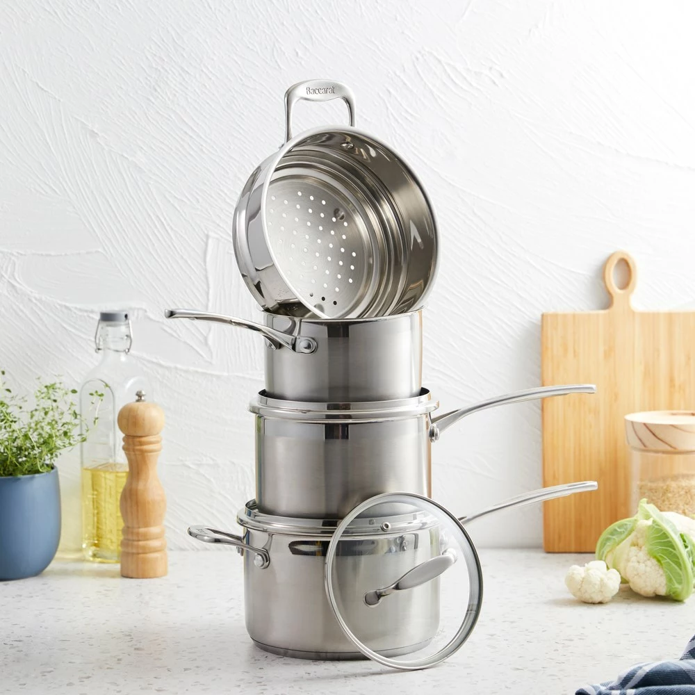 Simmer soups and sauces, create delicious reductions, cook grains and more with the stylish and versatile Baccarat iconiX 4-Piece Stainless Steel Cookware Set