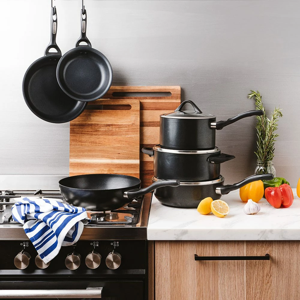 - Set includes 1 x 20cm Saucepan, 1 x 24cm Casserole, 1 x 26cm Chef pan, 1 x 20cm Frypans, 1 x 26cm Frypan, and a 28cm Stir-Fry pan
