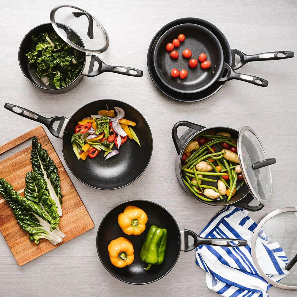 - Hard Anodised technology that is twice as hard as stainless steel, promotes rapid heat transfer and efficient heat distribution for even cooking