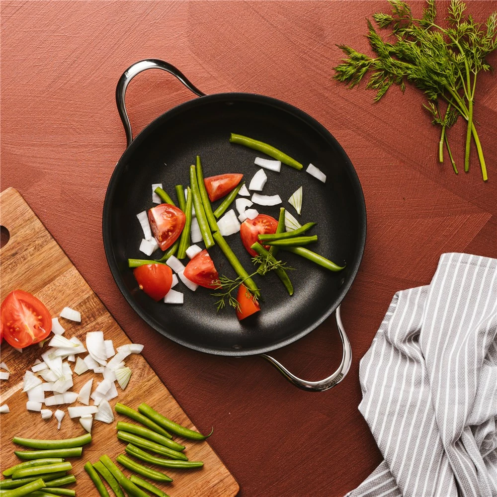 - Hard Anodised technology that is twice as hard as stainless steel, promotes rapid heat transfer and efficient heat distribution for even cooking