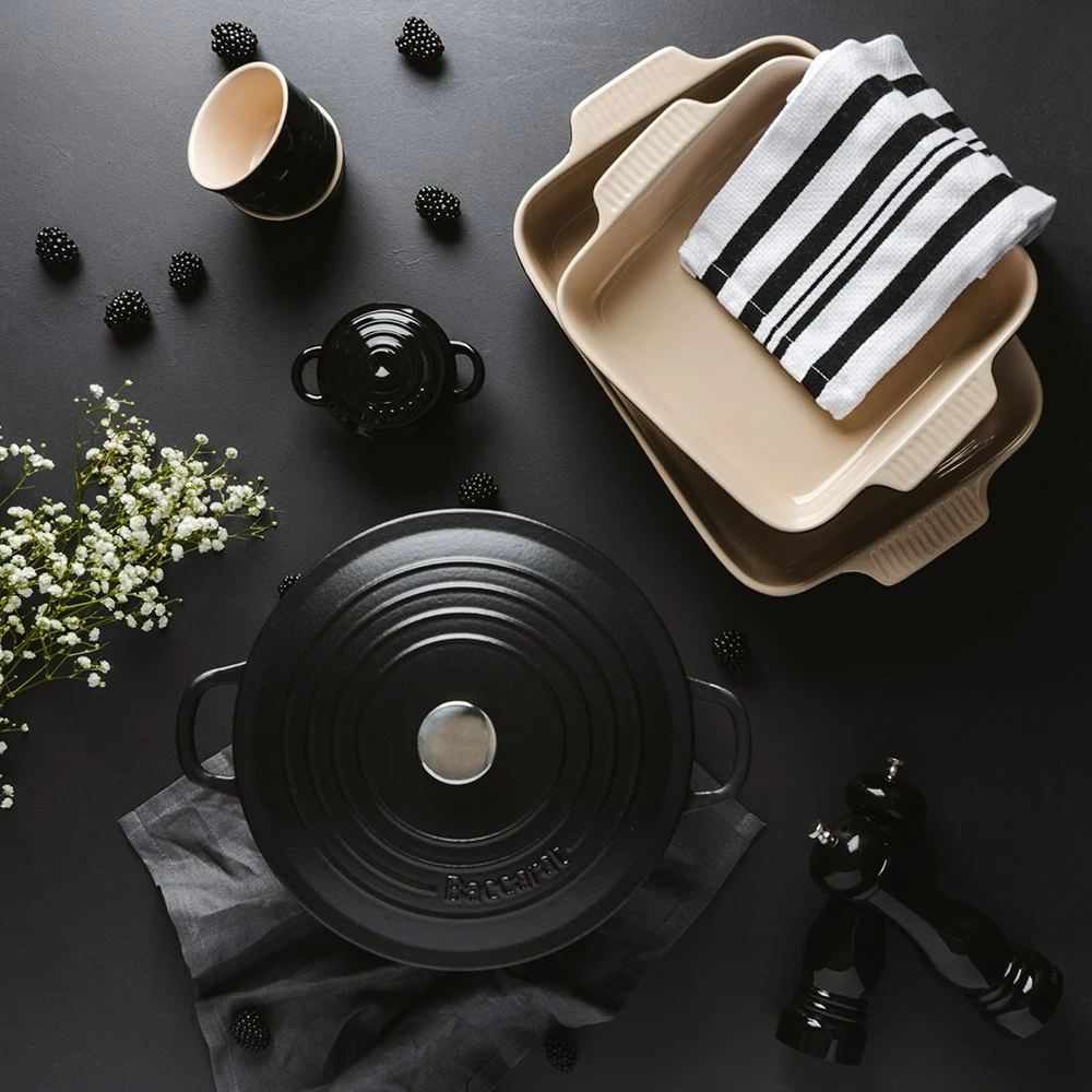 Master the art of French inspired cooking with help from the Baccarat Le Connoisseur Round French Oven. A must-have cookware piece for unleashing a new world of recipes, the Baccarat Le Connoisseur Round French Oven is crafted from the finest heavy-duty cast iron for ensured durability and even heat distribution. With a sleek black colourway and gloss enamel finish, the Baccarat Le Connoisseur Round French Oven will make a bold and stylish statement in your home that is designed to be taken directly from stove or oven to table, the Baccarat Le Connoisseur Round French Oven is the ideal cookware piece for creating delicious roasts, stews, soups and more, and features unique self-basting spikes on the underside of the lid that actively collect and channel moisture back into the dish, resulting in more flavoursome and succulent meals. Fitted with large handles that are easy and comfortable to grip, even when using oven mitts or pot holders, the Baccarat Le Connoisseur Round French Oven will look incredible at the centre of your table for a family meal. Dishwasher friendly for quick and efficient cleaning, the Le Connoisseur Round French Oven will become your go-to dish for creating delicious and inspired culinary creations.
