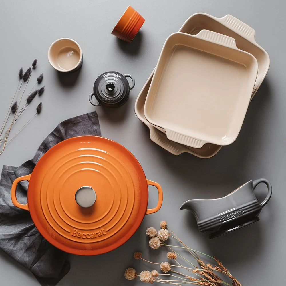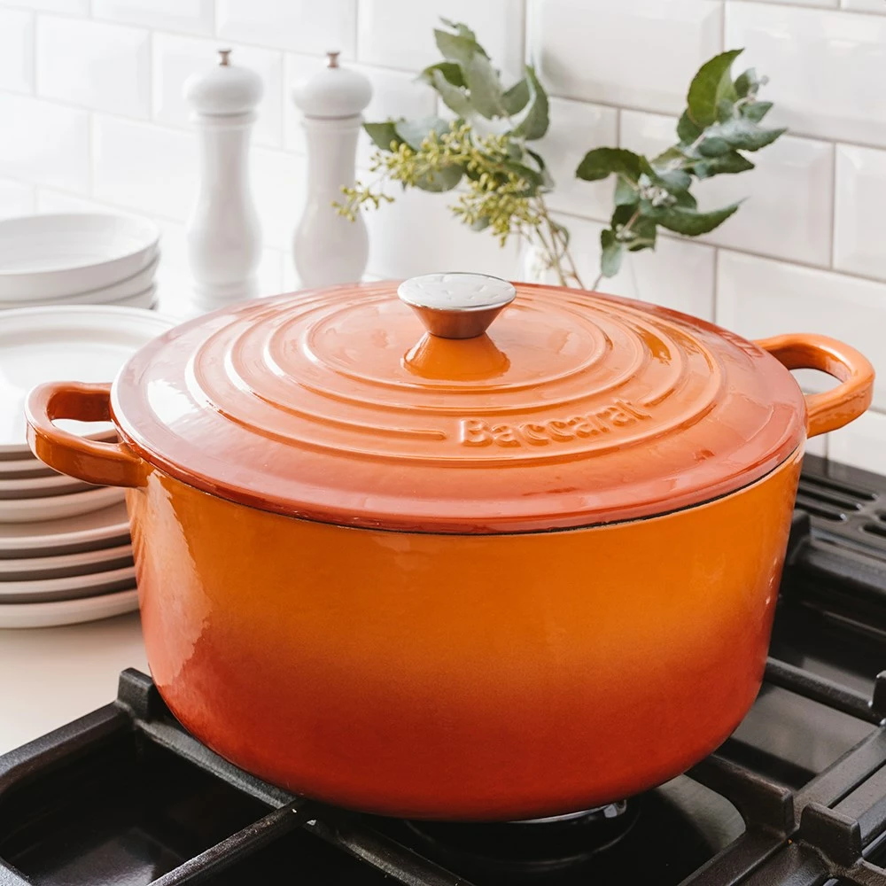 Explore your passion for cooking and create anything from casseroles to home baked bread with the Baccarat Le Connoisseur Cast Iron Round French Oven 29cm 6.3L in Orange.