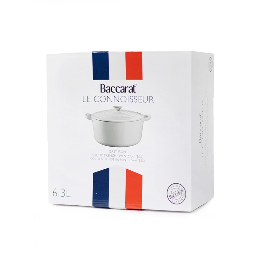 French inspired slow cooking is made easy with the Baccarat Le Connoisseur Round French Oven with Lid White 29cm 6.3L. The Le Connoisseur range uses cast iron due it being one of the best materials for retaining, conducting and distributing heat evenly, plus it?s suitable for all cooktops including induction. The heavy thickness of the body and lid is designed to encase the heat around the food for exceptional cooking results. Le Connoisseur features generously sized handles that ensures each piece is easy to hold and carry. The Baccarat Le Connoisseur Round French Oven with Lid White 29cm 6.3L has been designed to be transferred directly from oven to cooktop to table. Enjoy the rustic style and brilliant cooking properties of this beautiful cast iron cookware.