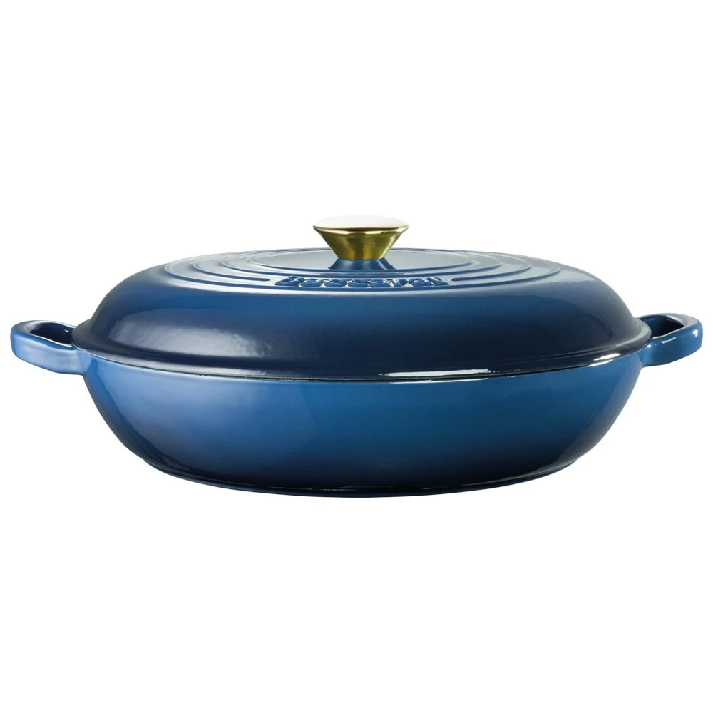 The Baccarat Le Connoisseur Round French Saute Pan is a stunning piece of cast iron cookware. With its elegant teal hue and heavy weight construction it will become a timeless classic in your kitchen. Made from cast iron it has a double layer enamel surface, which is easy to clean and does not require seasoning. The Baccarat Le Connoisseur Round French Saute Pan 31cm is suitable for use with all cooktops including induction and is dishwasher safe for your convenience, although hand washing is recommended. With a matching lid, the saute pan allows you to create a multitude of delicious dishes. The self-basting lid features spikes on the inside of the lid that work to collect moisture and drip it back into the dish, resulting in juicy and succulent meals. The handles on the Baccarat Le Connoisseur Round French Saute Pan are easy to lift and an industry standard Bakelite knob plus a gold stainless-steel knob are included with your pan. To show the brands commitment to quality, it comes with a lifetime guarantee from Baccarat when your pan is treated according to the Care and Use instructions.