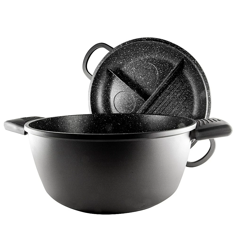 - 2-piece multi cooker set that enables you to fry, grill, and roast with ease
