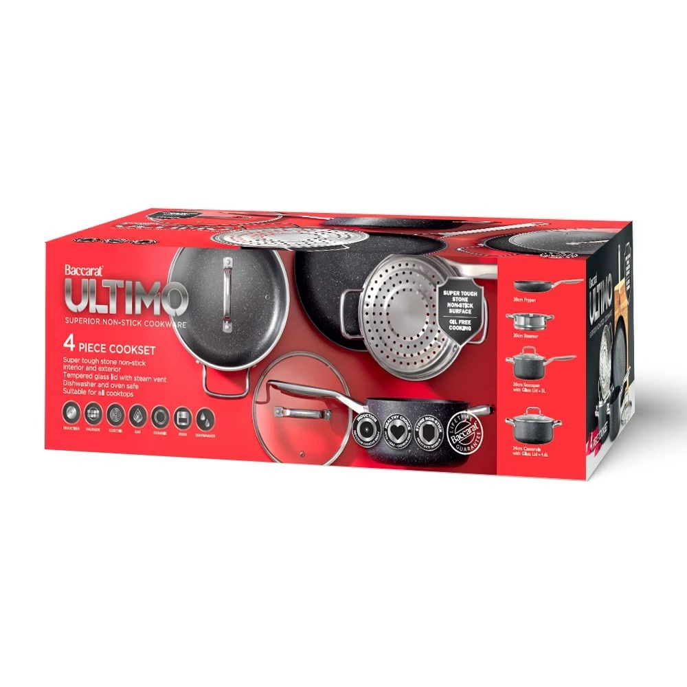 Experience Baccarat?s superior non-stick cookware with their new Ultimo 4 Piece Cookware Set! Crafted with a sturdy cast aluminium body, the Baccarat Ultimo 4 Piece Cookware Set features the brand?s toughest stone surface that not only ensures durability and quality is maintained over time, but provides a slick surface for the ultimate in non-stick, oil-free cooking. Rapid and even heat distribution from the base and through the body of the Baccarat Ultimo Cookware ensures that your food is cooked evenly and thoroughly every time, for perfect and delicious results that the whole family will enjoy. The Baccarat Ultimo non-stick coating is revolutionary ? completely Lead, Cadmium and PFOA chemical free, the Baccarat Ultimo Cookware offers you the safest cooking experience yet. Fitted with an induction ready base, the Baccarat Ultimo Cookware can safely be used on gas, electric, halogen, ceramic and induction cooktops, plus it?s oven and dishwasher friendly for total convenience.