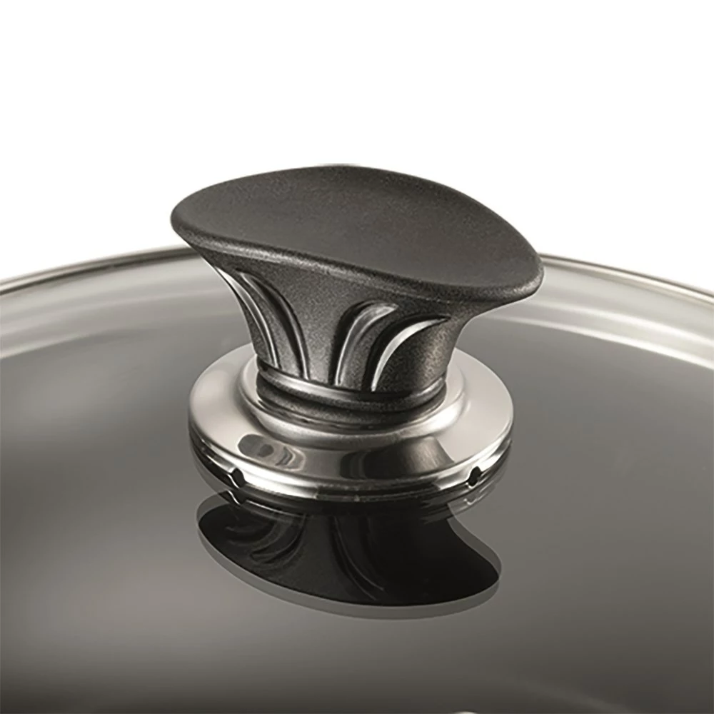 - Fitted with a patented stay cool knob handle, the Universal cookware lid remains safe and comfortable to grip and handle during and after cooking
