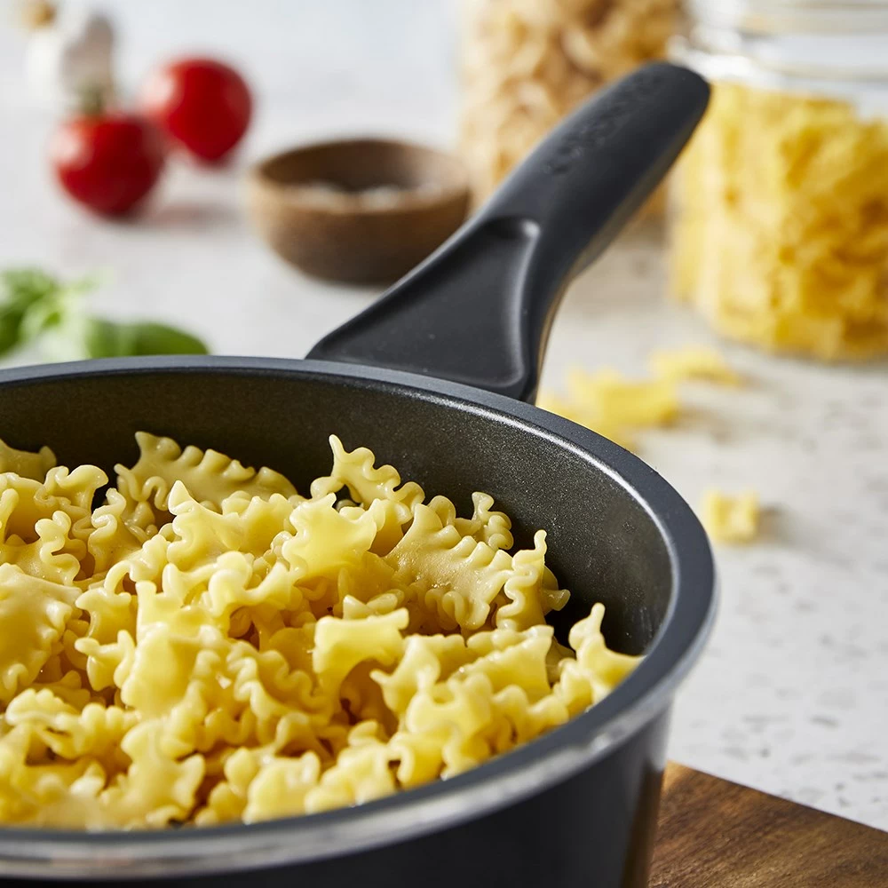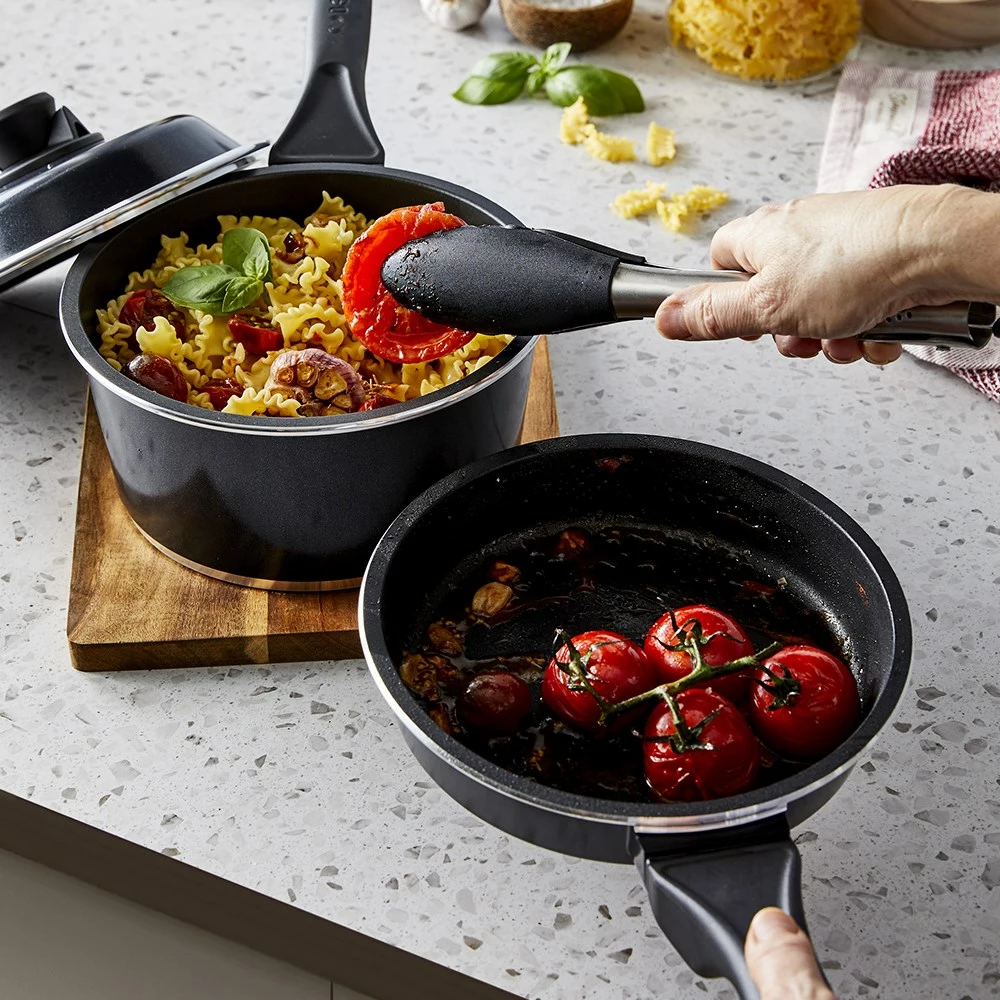 - Set includes 1 x Bessemer Non Stick Frypan 20cm Ebony, Bessemer Non Stick Saucepan 20cm Ebony, and 1 x Bessemer Universal Lid 20cm Ebony