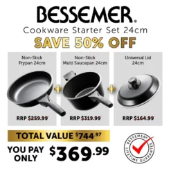 With generations of families using them, there’s no reason not to trust in the Bessemer name ? and now the iconic Australian cookware brand is available at House! The legacy of Bessemer speaks for itself, with many pieces still providing families with unparalleled results for decades. Whether you’re finally replacing mum’s old set or just looking to get one of your own, you can build an all-powerful cookware set with just a few pieces from Bessemer’s core signature range like this 3 Piece Cookware Starter Set! Made using the same methods for 50 years, Bessemer cookware is crafted using premium grade, heavy gauge cast aluminium ensuring that Bessemer cookware is lighter and just as durable as your cast iron favourites, plus they can even cook oven staples like cake, pizza and roast on the stovetop thanks to their extra deep body and Bessemer’s patented ?oven effect” cooking capabilites when paired with the Bessemer Non Stick Universal Lid. The interior and exterior of Bessemer cookware features a premium European ceramic fusion triple layer non stick coating that provides smooth and effortless food release, abrasion and scratch resistance, and fast clean up every time you cook. Fitted with a magnetic stainless steel induction plate, Bessemer cookware is suitable for use on all cooktops and ensures a rapid and even heat distribution to prevent hot and cold spots, providing you with perfect results. For added comfort and safety, Bessemer cookware is fitted with soft, stay cool handles that are generously sized for a secure grip and remain cool to the touch. This Set includes 1x Bessemer Non Stick Frypan 24cm Ebony, 1x Bessemer Black Multi Saucepan 24cm and 1x Bessemer Universal Lid 24cm Ebony. Food definitely tastes better in a Bessemer?.