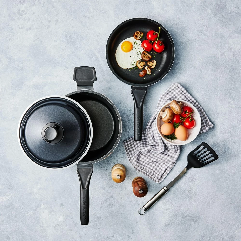 - Set includes 1x Bessemer Non Stick Frypan 24cm Ebony, 1x Bessemer Black Multi Saucepan 24cm and 1x Bessemer Universal Lid 24cm Ebony