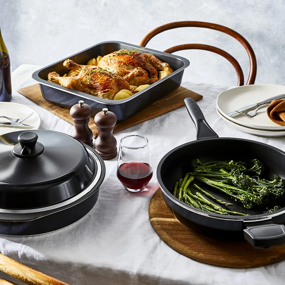 - Set includes 1 x Bessemer Non Stick Dutch Oven 32cm Ebony, 1 x Bessemer Multi Frypan 32cm Ebony, 1 x Bessemer Universal Lid 32cm Ebony, and Bessemer Non Stick Roaster 40cm Ebony