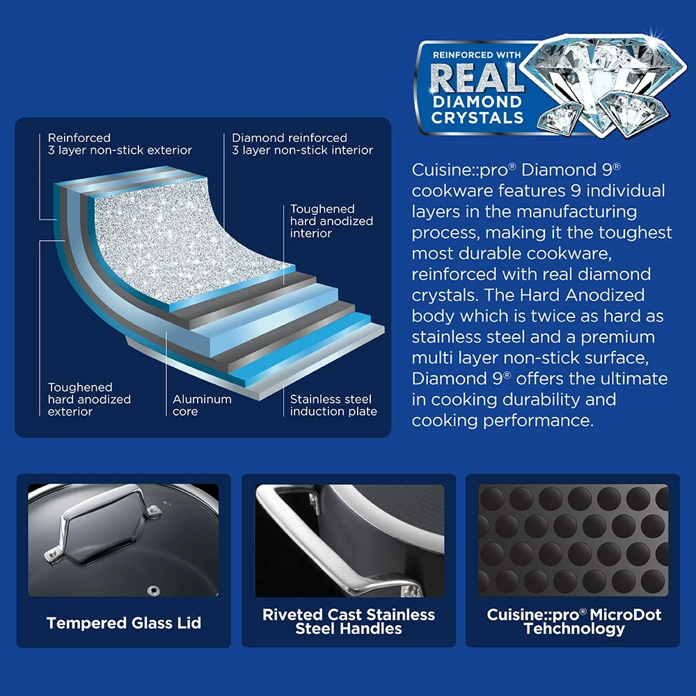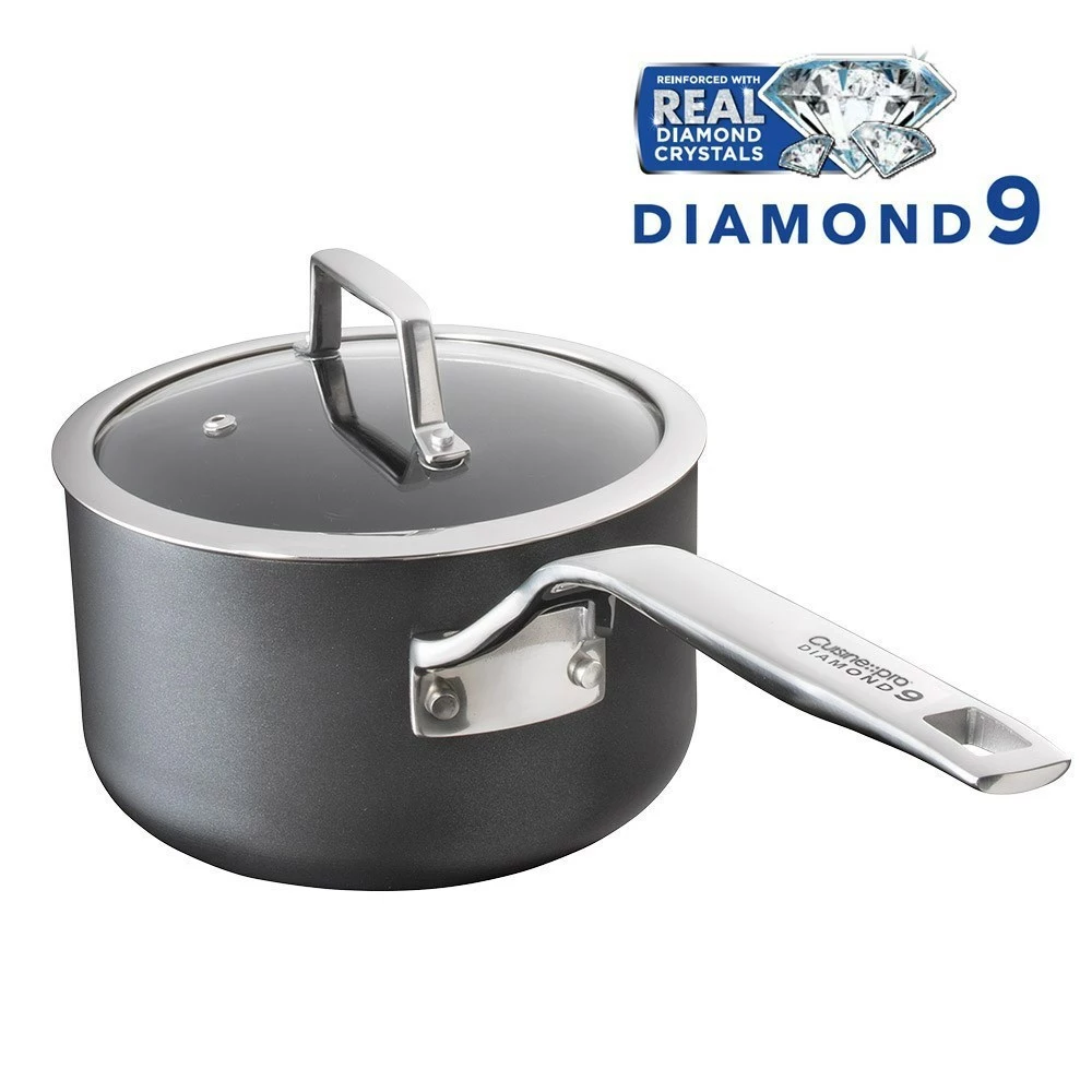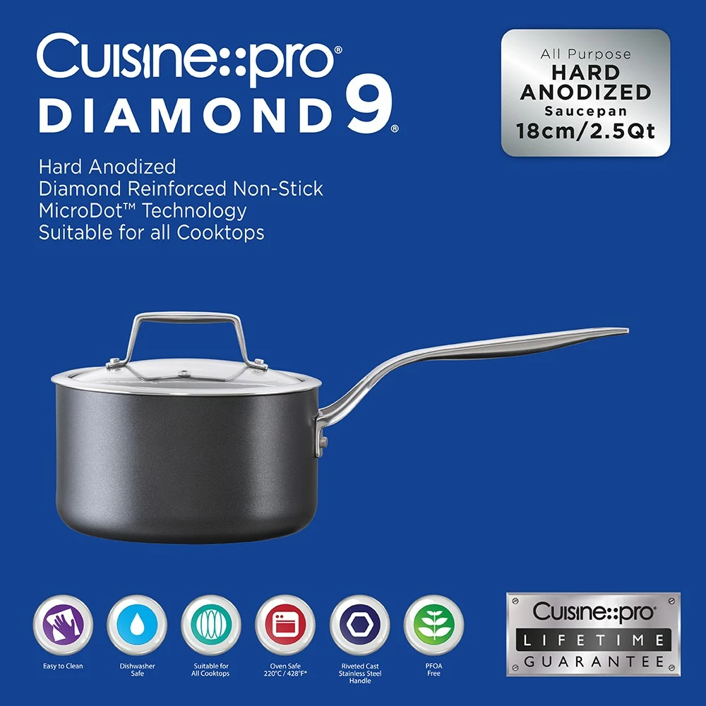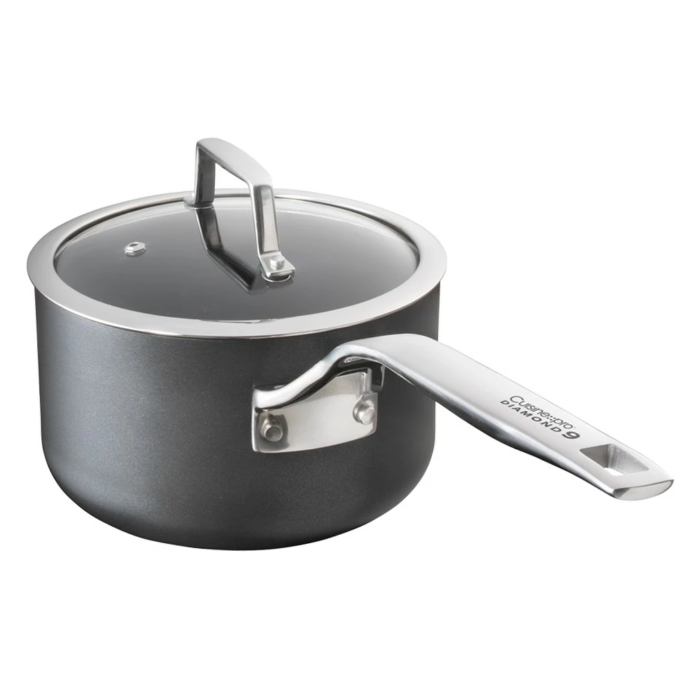 Prepare tasty meals with ease and achieve exceptional results everytime you cook with the Diamond 9 Hard Anodised Non-Stick Saucepan by Cuisine::pro!