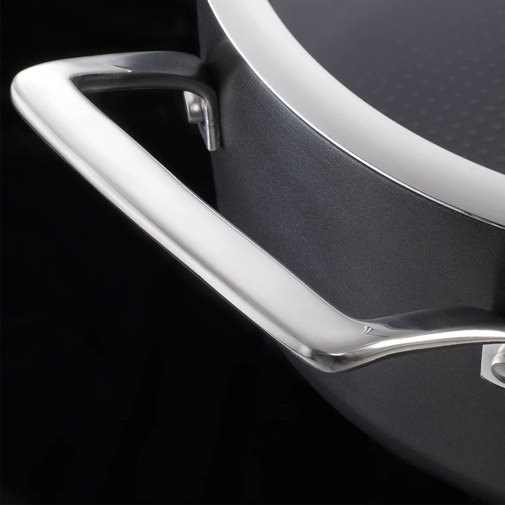 - Designed with riveted cast stainless steel handles that are designed to curve up and away from the heat source. These handles are riveted to the cookware for superior strength and durability and feature the latest in stay cool technology