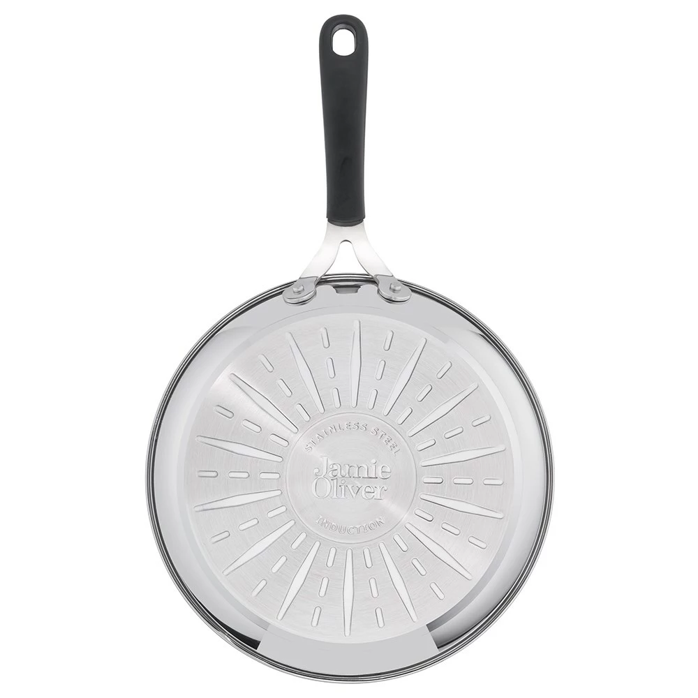 Cook and serve with the practical, stylish Jamie Oliver by Tefal Kitchen Essentials Induction Non-Stick Stainless Steel Frypan 28cm