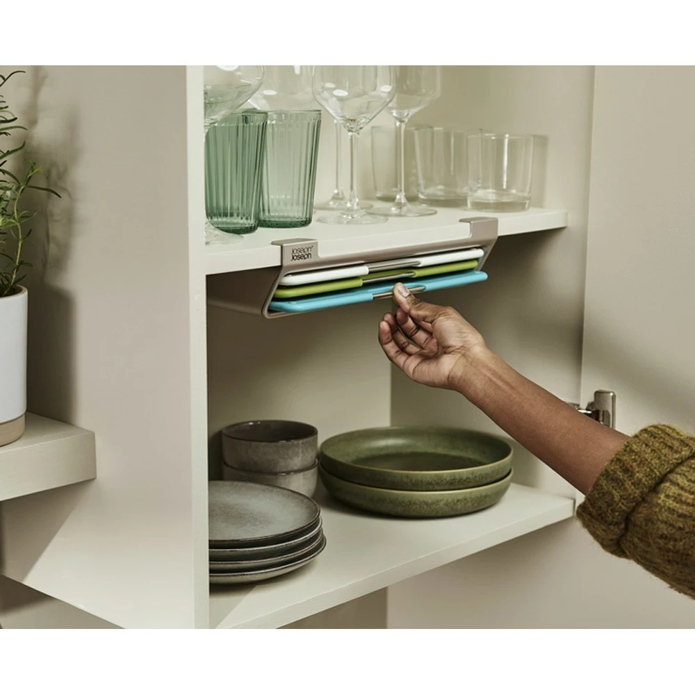 Even the most compact of kitchens can be stocked with premium quality kitchenware thanks to the Joseph Joseph Folio Slim 3 Piece Under-Shelf Chopping Board Set