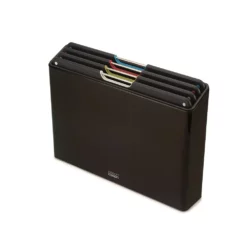 Elevate your at home culinary experience with the Joseph Joseph Folio Steel 4 Piece Chopping Board Set Carbon Black. Comprising of a carbon black coloured slimline case and four chopping boards, the set will look fantastic placed on the countertop of a host of different style kitchens. With four colour coded chopping boards to help avoid cross contamination, each board benefits from a double sided textured cutting surfaces and non-slip feet for safe chopping, slicing and dicing. The innovative case from the Joseph Joseph Folio Steel 4 Piece Chopping Board Set Carbon Black holds the boards separate so the air can circulate around them to avoid bacteria growth. The case also benefits from a fingerprint proof stainless steel outer that is effortless to keep clean. The Joseph Joseph Folio Steel 4 Piece Chopping Board Set Carbon Black is also available in sleek rose gold and stainless steel colours to complement your kitchen.