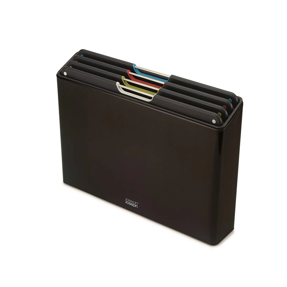 Prepare your meals in style with the beautifully designed Joseph Joseph Folio Steel 4 Piece Chopping Board Set Carbon Black