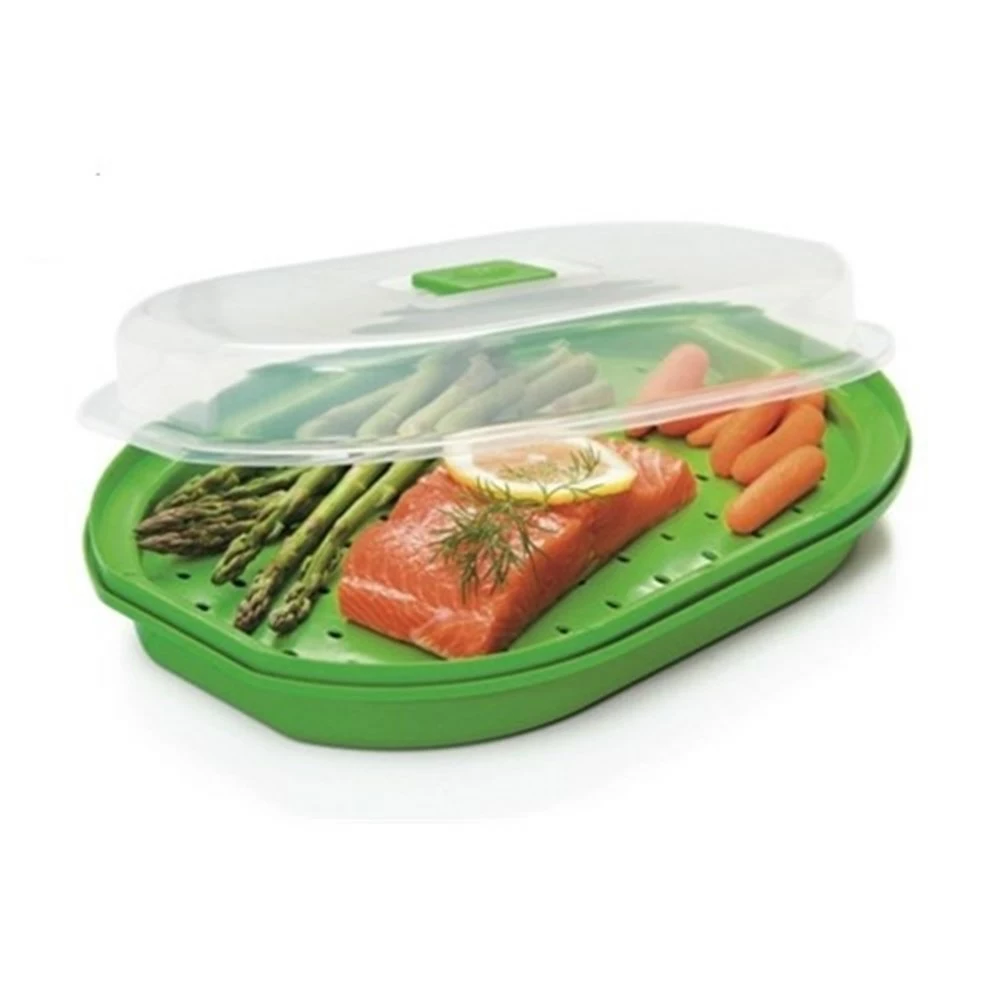 - Fill the bottom container with water, put the tray with steam vents on top with food and then put on the lid and microwave