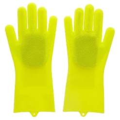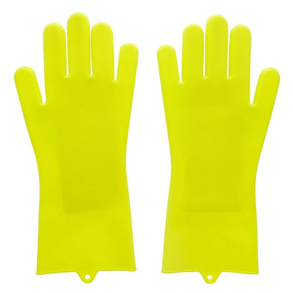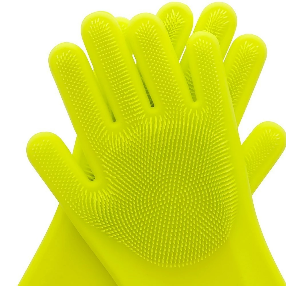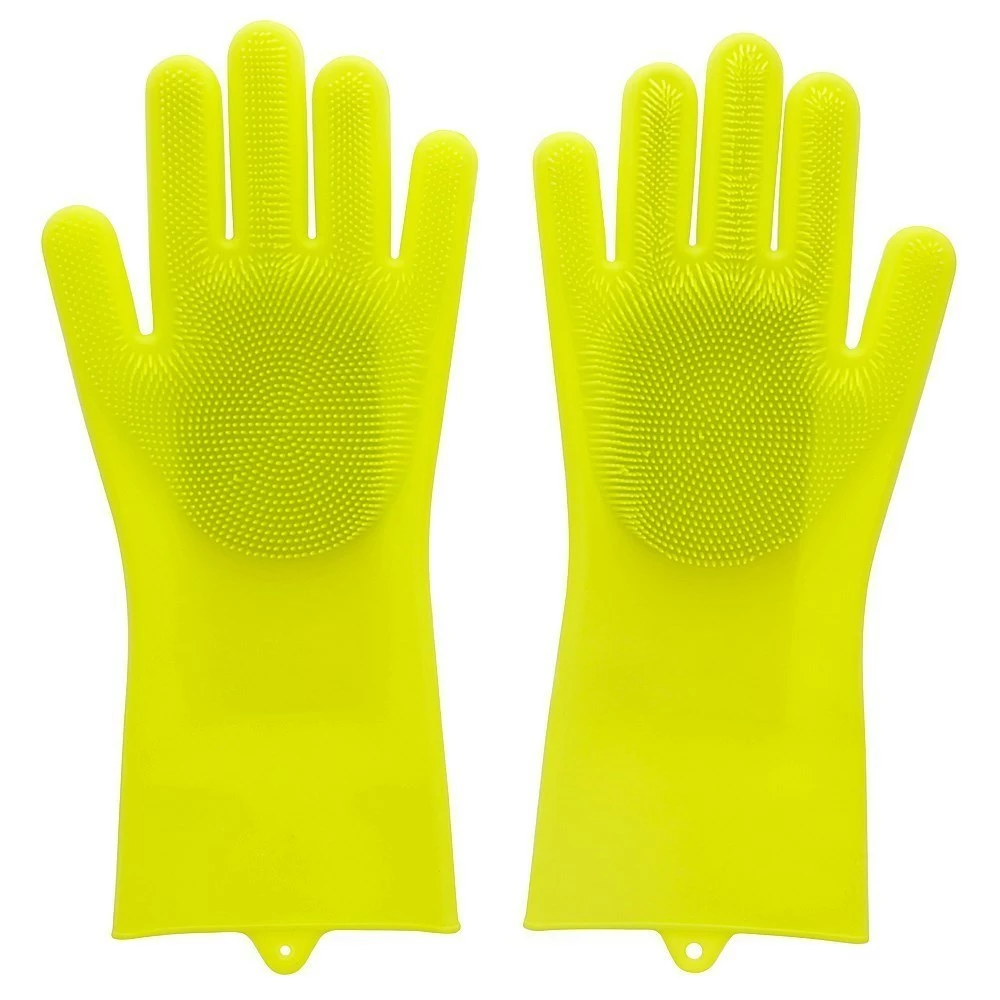 - Both gloves are equipped with silicone cleaning bristles that effectively scrub food and grime from dishes without causing damage