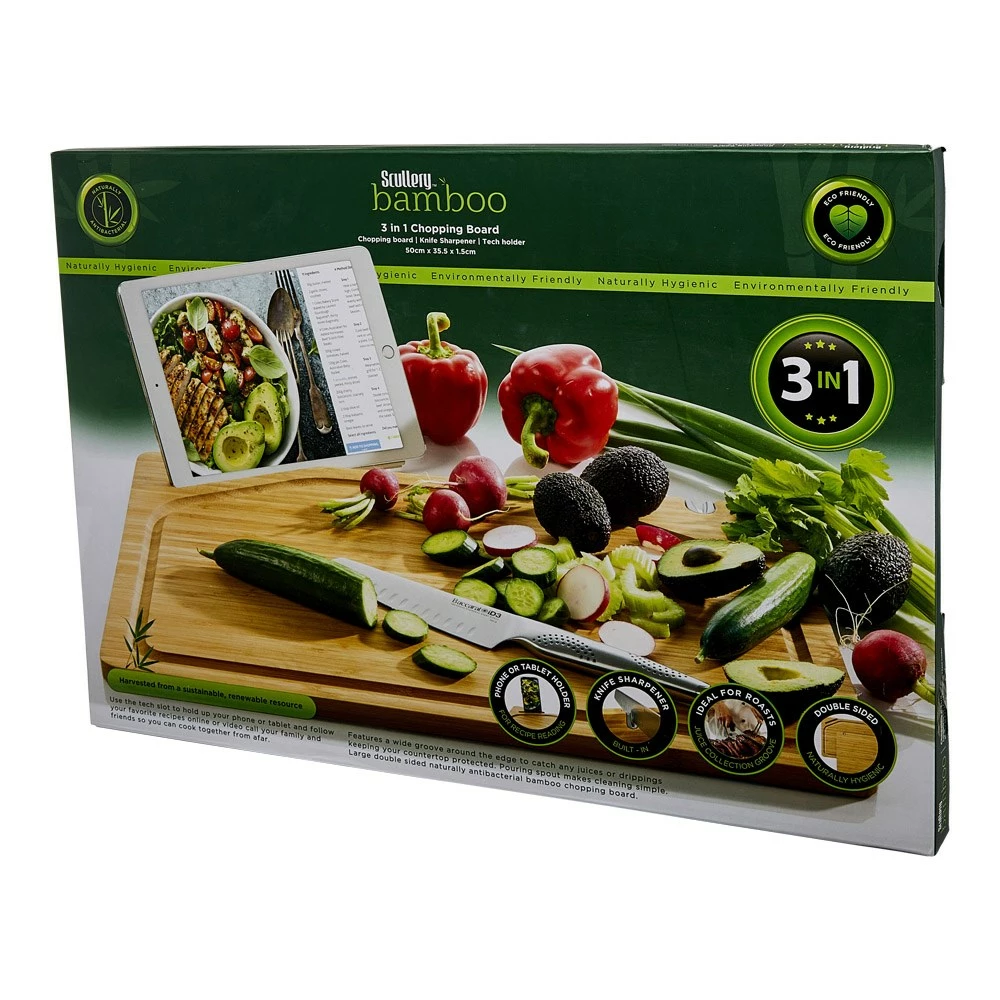 - Multi-purpose chopping board with built in knife sharpener and tech holder