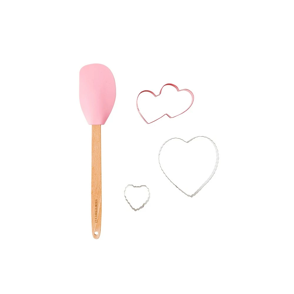Pour a little love into your baking creations with the Soffritto Bake House 4 Piece Love Baking Set. A loving theme extends to each item in this set, designed to create a feeling of connection through cooking. This 4 piece set includes a spatula, double heart cutter, large heart crinkle cutter and small heart crinkle cutter for every dimension of affection. Each heart cutter is made of high quality stainless steel, protected against wear and tear, while the silicone spatula features a beechwood handle, renowned for its weighted feel and natural high strength properties. Its light pink colouring adds a touch of warmth into your baking accessories. A perfect gift for baking lovers amongst family and friends!