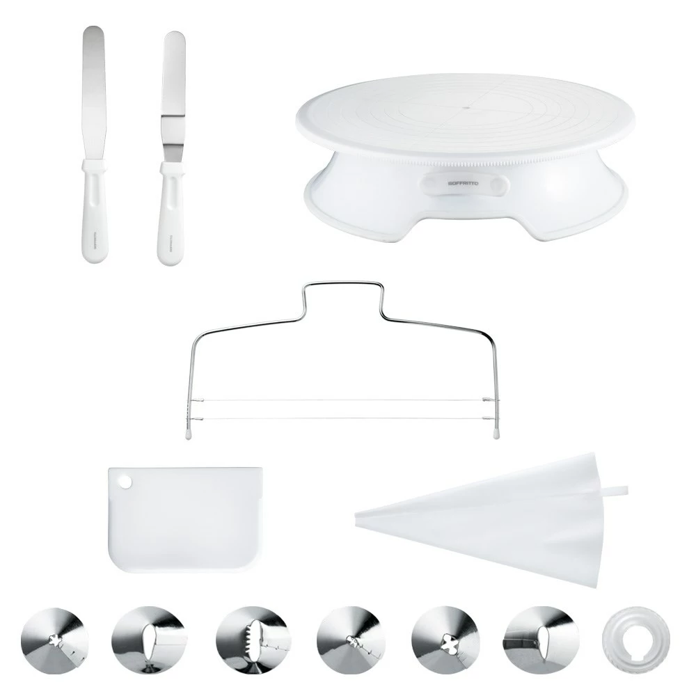- Set comprises of 1 cake turntable, 1 cake leveller, 1 scraper, 2 spatulas, 1 piping bag, 1 coupler and 6 nozzles