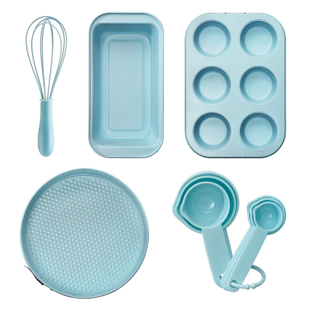 - Includes a 6 cup muffin pan, loaf pan, spring form pan, silicone whisk, as well as 6 measuring spoons and cups
