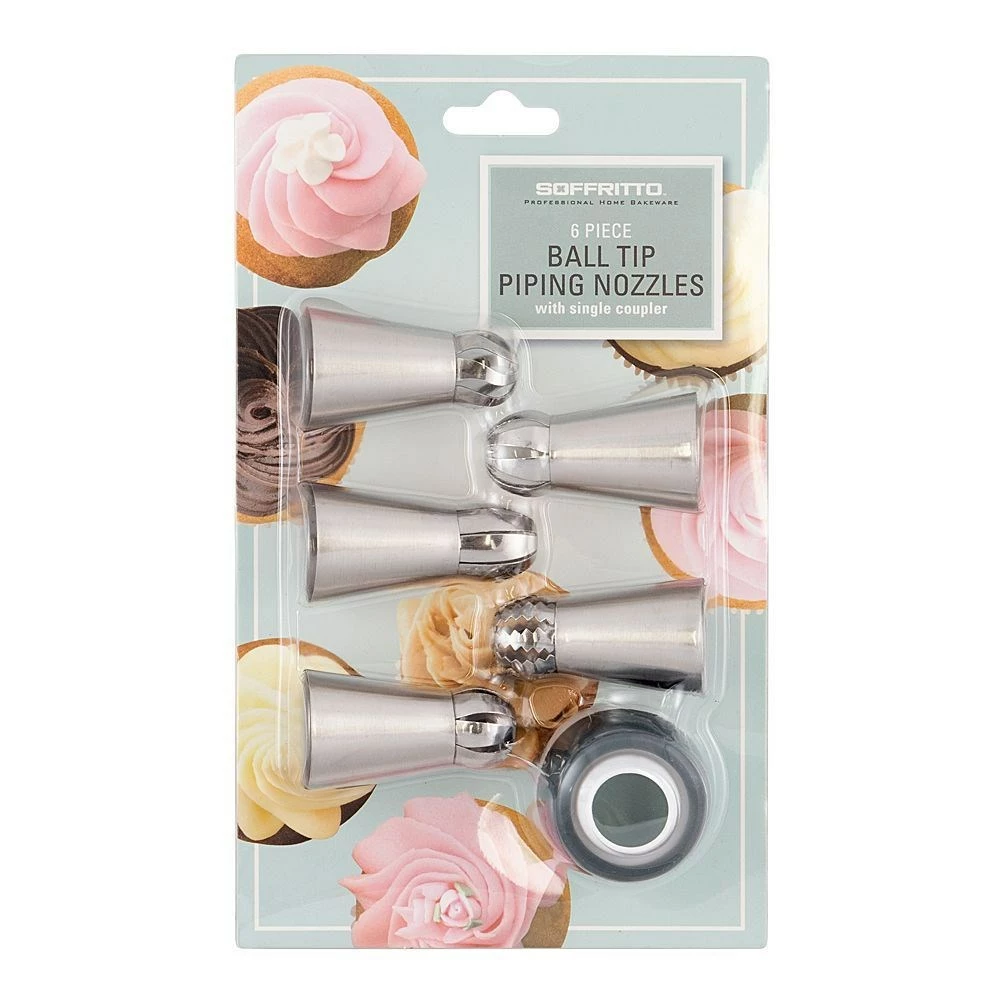 Bring some extra flair to your home baking experience with the Professional Bake 6-Piece Russian Ball Tip Nozzle Set by Soffritto. Featuring five ball tip piping nozzles and a single coupler, this set is an essential for decorating your delicious cupcakes, cakes and cookies. Made from premium quality stainless steel, the ball tip nozzles are durable and guaranteed to offer endless excellent baking experiences. Jazz up your delicious baked creations with a personal touch with this unique set by Soffritto. Pair with additional products from the Professional Bake range by Soffritto and achieve professional quality results right from the comfort of your home!