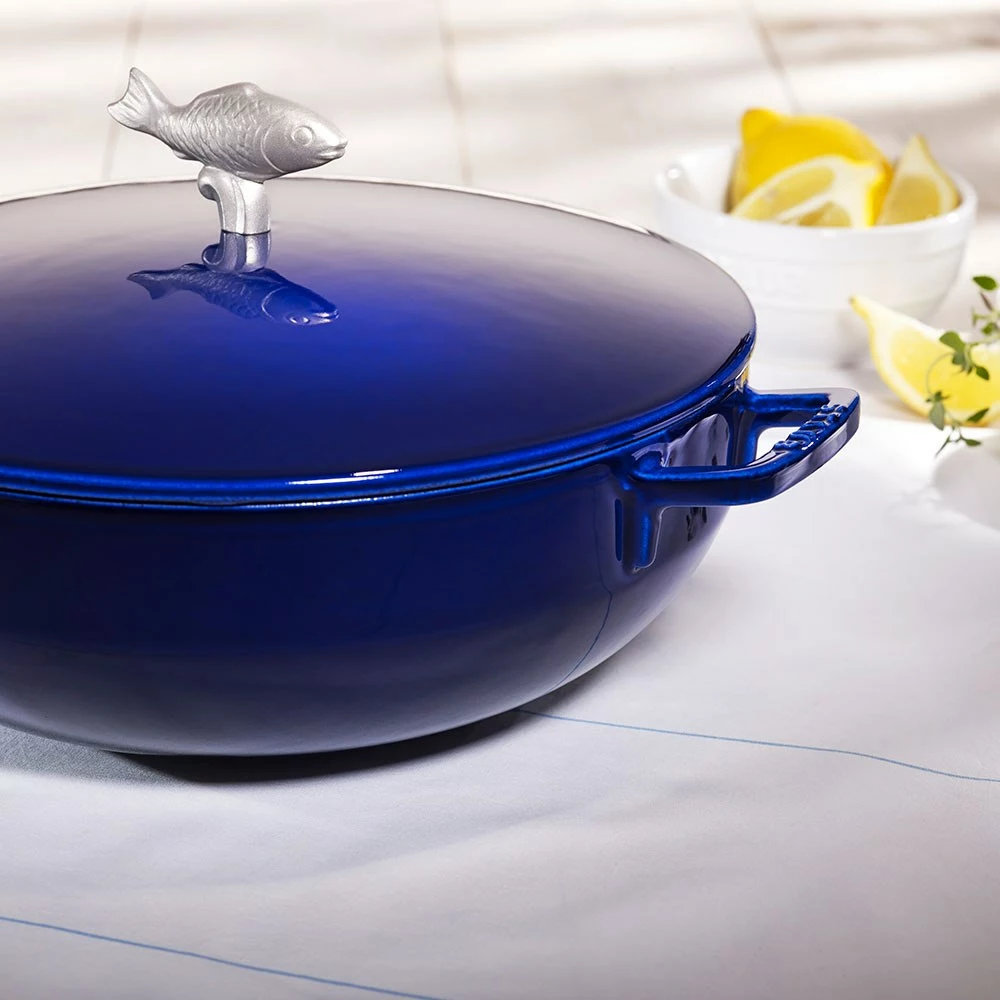 Enjoy intensly flavoursome and aromatic results everytime you cook with the stylish enamelled blue cast iron Bouillabaise Pot 28cm by Staub