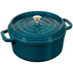 Enjoy intensely flavoursome food with natural delicious aromas and vitamins by cooking with the high-performance Round Cocotte 20cm/2.2L by Staub! Finely crafted from superb quality cast iron, this cocotte is a heavy-duty piece of cookware that absorbs, retains and distributes heat exceptionally well. It offers a capacity of 2.2 litres, and is perfectly sized for cooking and serving delicious smaller sized portions of casseroles, braised meats, roast vegetables and much more! Made in France, it is beautifully designed with a glossy La Mer blue enamelled exterior that makes the Round Cocotte a fantastic showpiece for your delicious homemade meals. The Round Cocotte comes complete with a heavy and tight-fitting lid with self-basting spikes for continuous and even distribution of juices throughout cooking. Treat your dinner guests to delicious and richly flavoursome food every time you cook with the enamelled cast iron Round Cocotte by Staub!