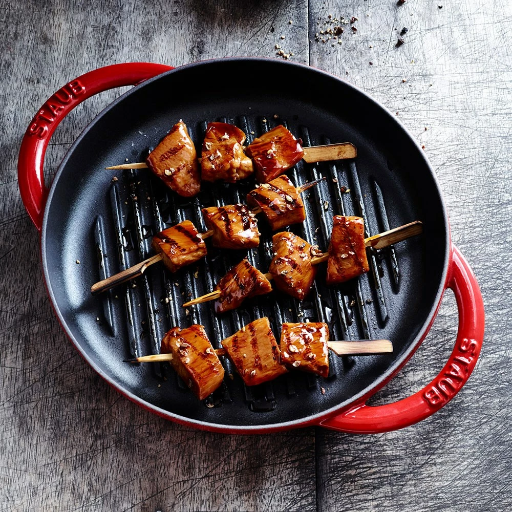 Prepare delicious grilled meats, vegetables, cheeses and more with the high-performance, enamelled cast iron Pure Grill Pan 26cm in vibrant cherry red by Staub!