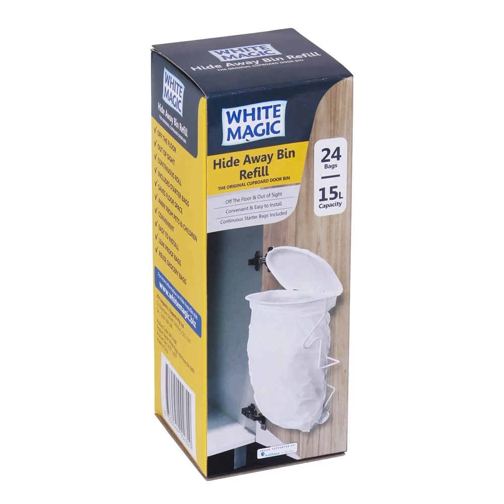 The White Magic Hide Away Bin Refill comes in a Continuous roll of 24 bags which are leak proof with a capacity of 15L. The bin fits perfectly into cupboards and pantries and is great for homes with pets or children. Simply change the White Magic Hide Away Bin Refill roll over when they are running low.