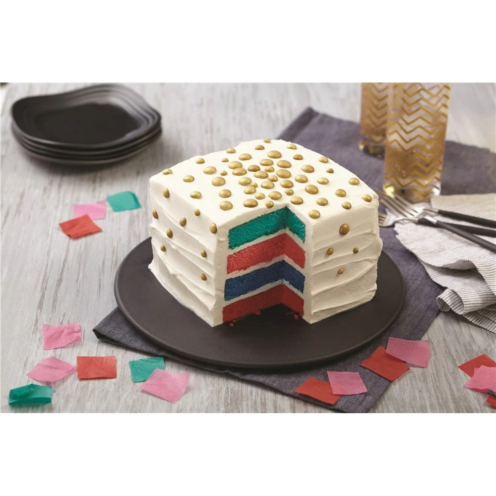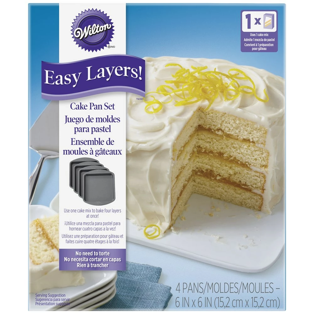 Layering cakes has never been easier with the 4-Piece Easy Layers Square Cake Pan Set